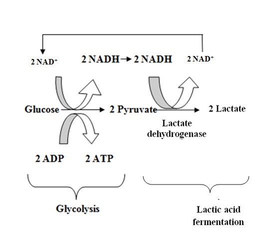 Then, pyruvate is converted into 2 molecules of lactic acid with the utilization of 2 NADH. It creates NAD⁺ lost during glycolysis and thus helps glycolysis to continue.