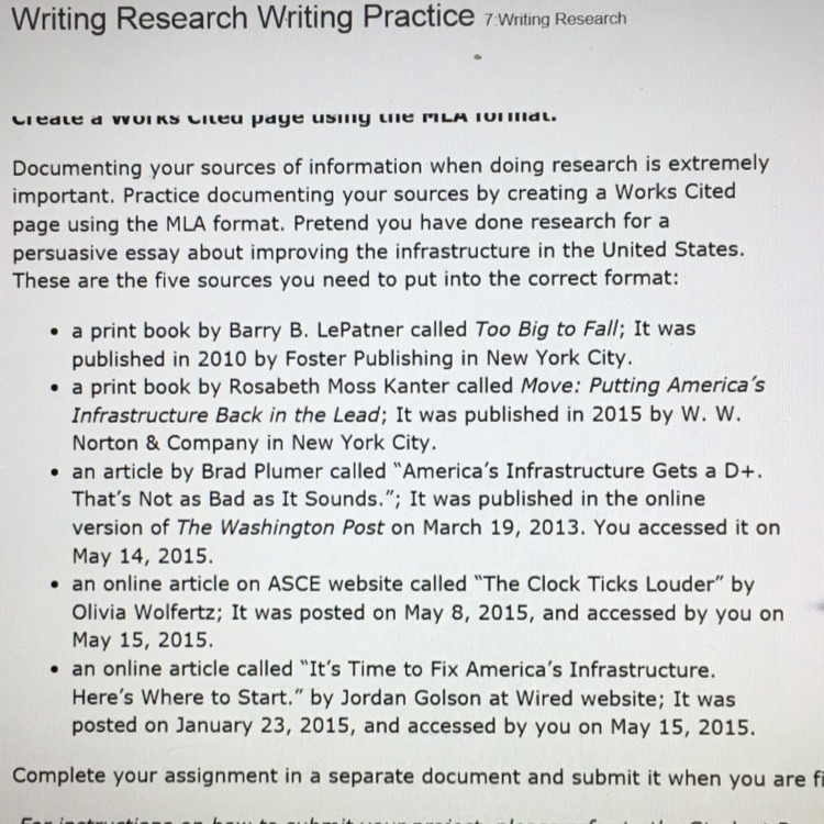 Ok, it's asking you to pretend you have written a persuasive essay about improving the infrastructure in the United States and you must list the sites you've used.
