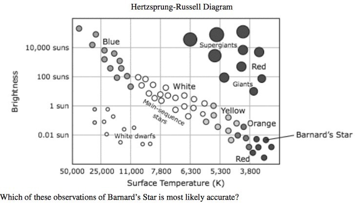A. Barnard’s Star is less bright than the sun, has a surface temperature below 3,800 K, and is red.