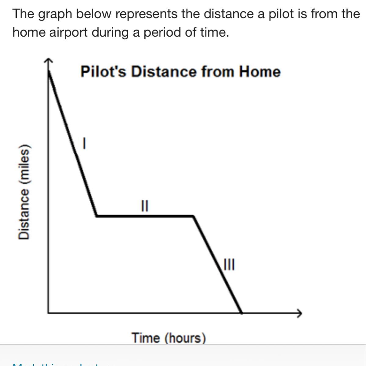 Then we get to the second part of the graph, we can see that the distance remains constant for a lapse of time, this means that the position of the pilot is not changing (so the pilot may be resting in a given airport), so he the distance between him and the home airport does not change.