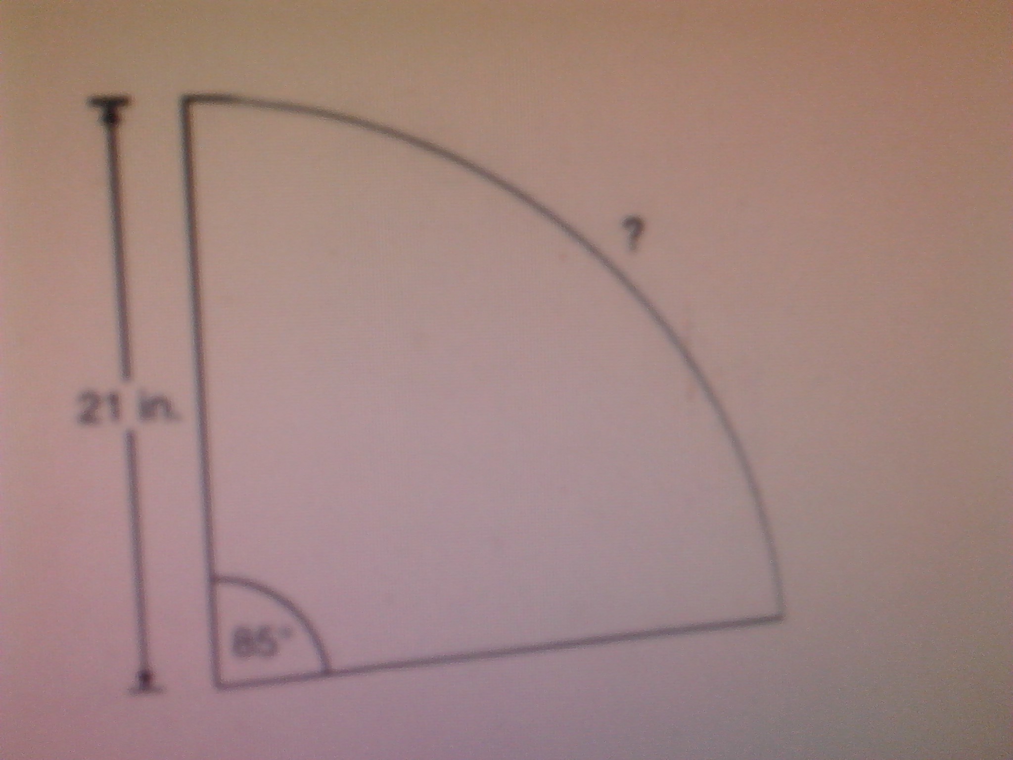 I FOUND YOUR COMPLETE QUESTION IN OTHER SOURCES. PLEASE SEE ATTACHED IMAGE. For this case what you should do is find the arc length. By definition, the arc length is given by: s = R * theta Where, R: radio theta: angle Substituting values: s = (21) * (85 * (pi / 180)) s = 31.15412715 nearest whole number: s = 31 inches Answer: C 31 inches