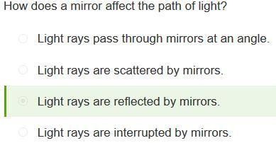 I believe your answer would be D) Light rays change direction when they hit a mirror. Since if a light ray encounters a smooth and shiny surface, such as a mirror, the rays will indeed bounce off the surface casting it to go into a different direction. I paraphrased from an article, if you want to learn more on the Reflection and Refraction of Light then I suggest you check it out just search up "Why do light rays change direction when they pass through a mirror." Should be the first result if not then it's published by "Live Science"