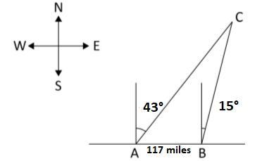 According to this, we have a triangle there, and we need to calculate the distance between C and A (Distance AC). This is the diagonal of that triangle. We only have the length of side AB which is 117 miles, and now, to get the side AC we need to use the sin law.