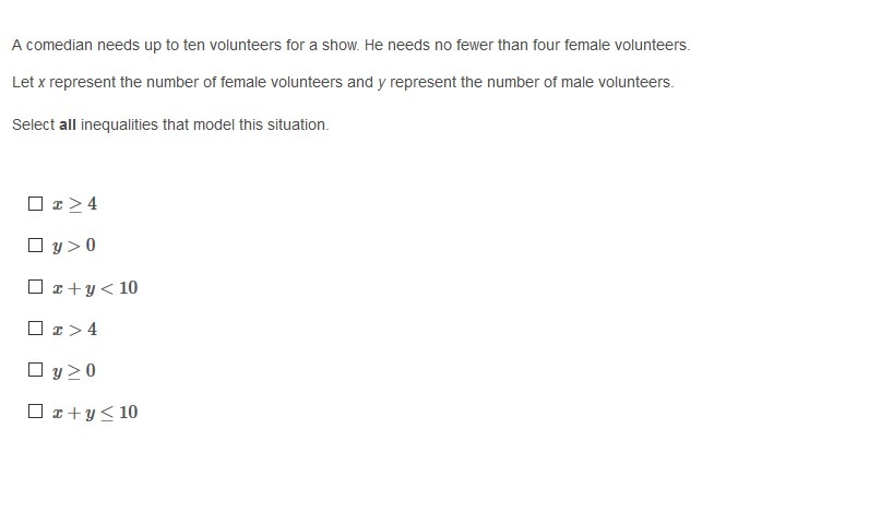 The third option is wrong because it says that male and female volunteers, together, make less than 10 people. But the comedian needs up 10 people, so there could be 10 people, and this option is wrong as well.