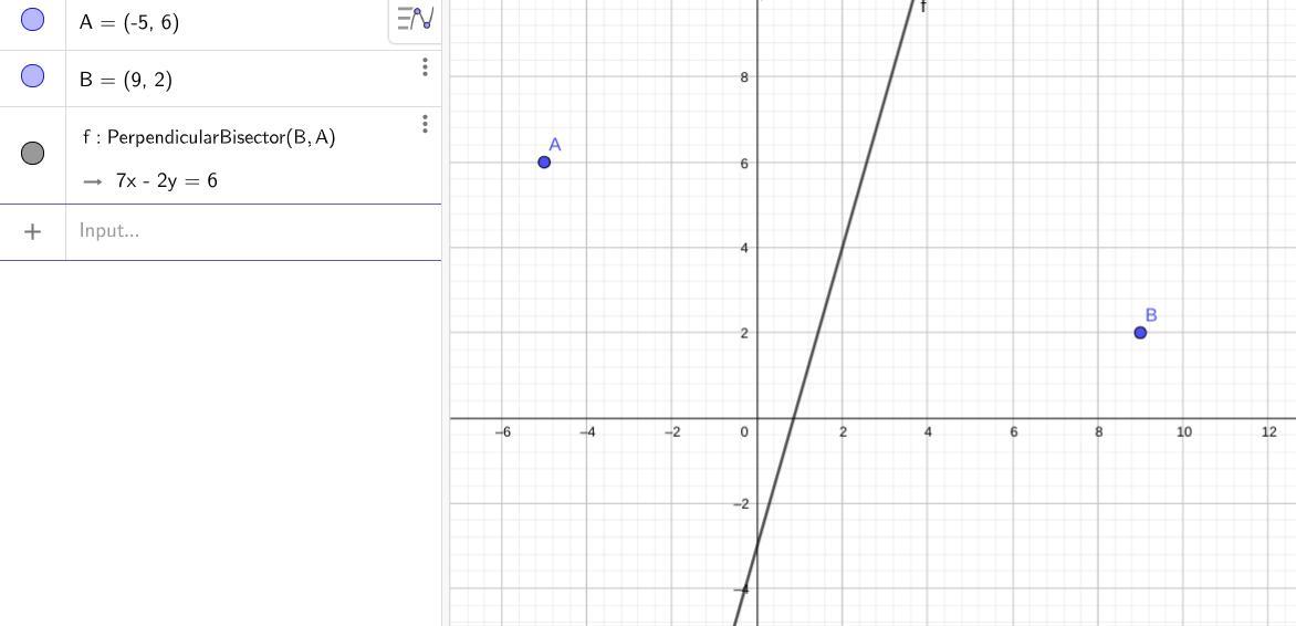 The perpendicular bisector has a slope that is the opposite of the reciprocal of the slope of the segment between the two points. It must go through the midpoint of the segment.