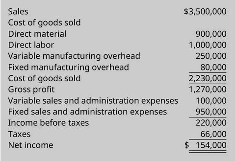 \left[\begin{array}{cccc}$unit sale&100000&90000&80000\\$sales revenue&3500000&3150000&2800000\\$COGS&&&\\$Material&900000&810000&720000\\$Labor&1000000&900000&800000\\$VMO&250000&225000&200000\\$FMO&80000&80000&80000\\$total&2230000&2015000&1800000\\$gross profit&1270000&1135000&1000000\\$V S and A&100000&90000&80000\\$F S and A&950000&950000&950000\\$operating income&220000&95000&-30000\\$tax expense&66000&28500&\\$net income&154000&66500&-30000\\\end{array}\right]