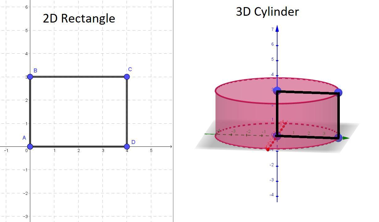 Check out the diagram below. Plotting A,B,C,D forms a rectangle. Rotating the flat 2D rectangle around the y axis will form a 3D cylinder. Think of a revolving door.