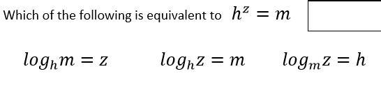 Your base is raised to the power of your answer and that exponent is set to equal the argument. In your case, if h is raised to the z power, and is set to equal m, then h is the base, your power on the h is the answer z, and is set to equal the argument m. The choice you want is the first one.