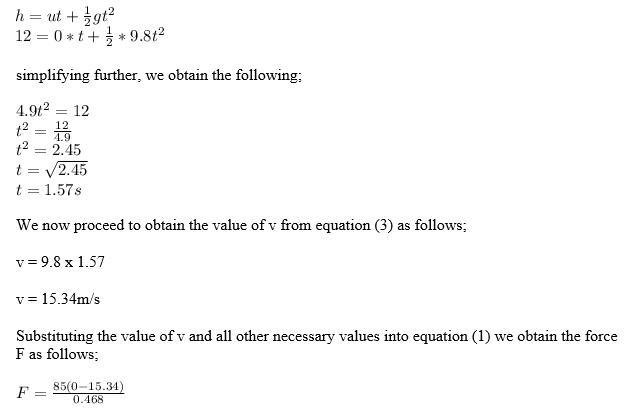 t is the time taken for her to fall through the height h = 12m, so we use the second equation of motion to find it as follows;
