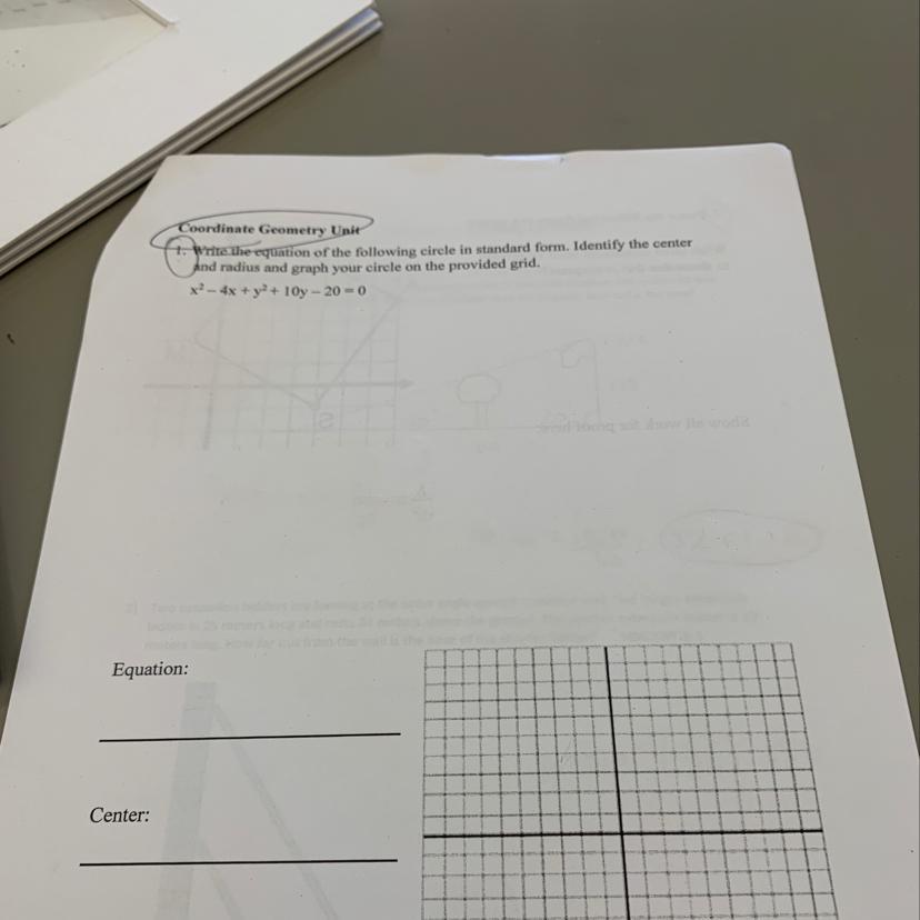 (x - 2)² + (y + 5)² = 49. The equation of the circle in standard form from the equation x² - 4x + y² + 10y -20 = 0 is (x - 2)² + (y + 5)² = 49, where the center c(2, -5) and the radius r = 7.