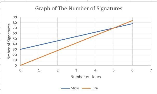 5) The meaning of the solution is that is Mimi and Rita continue collecting signatures at their respective constant rate of 8 and 14 signatures per hour, given that Mimi already has 30 signatures, they will have the same number of 70 signatures after 5 hours
