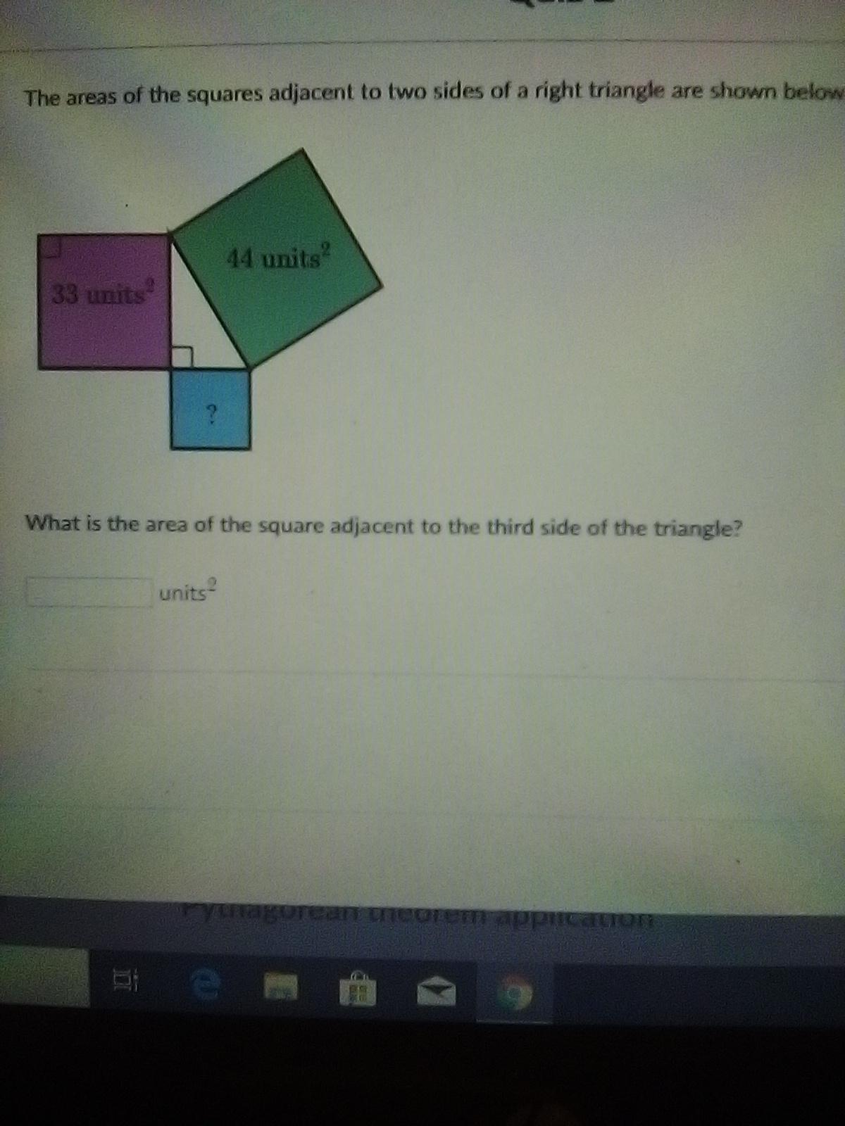 We are given the area of two squares, one being 33 units² the other 44 units². A square is present with all sides being equal, and hence the length of the square present with an area of 33 units² say, should be x² = 33 - if x = the length of one side. Let's make it so that this side belongs to the side of the triangle, to our convenience,