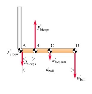 Ans: 1. τbiceps = +(Positive)2. τforearm = -(Negative)3. τball = -(Negative)Explanation:The figure is attached down below.