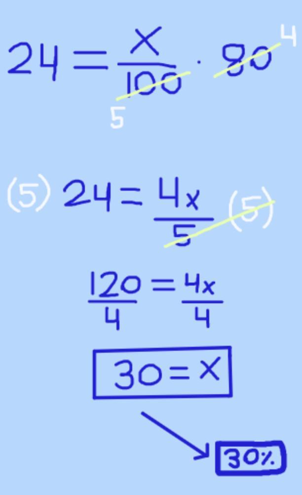Step-by-step explanation: Reading through the problem we have <em>24 is</em>, that's <em>24 equals</em>, <em>what percent</em> means <em>x/100</em>, <em>of 80</em>, means times 80.