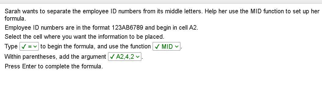 Sarah wants to separate the employee ID numbers from its middle letters. Help her use the MID function to set up