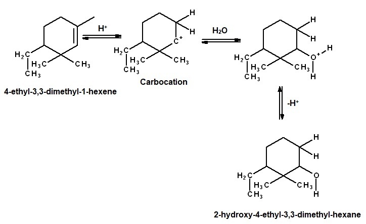The 4-ethyl-3,3-dimethyl-1-hexene converts to 2-hydroxy-4-ethyl-3,3-dimethyl-1-hexane as a major product by acid catalyzed hydration reaction.