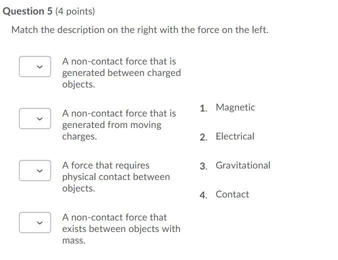 1.A non-contact force that is generated between charged objects is known as "Magnetic force" eg: train tracks, new roller coaster, a compass, motor.
