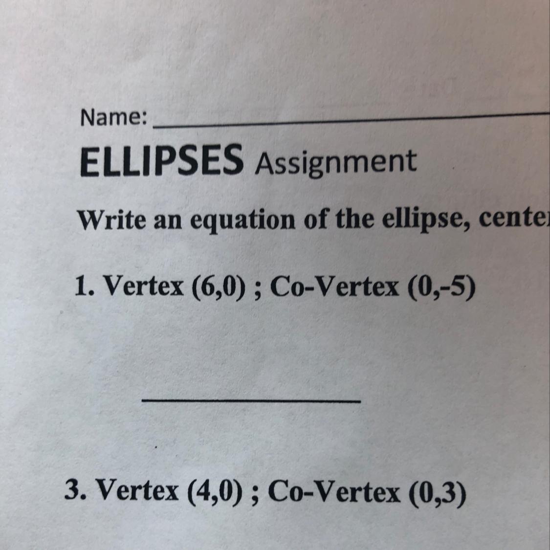 Write an equation of the ellipse centered at the origin given its vertex and co vertex ps can plz do both