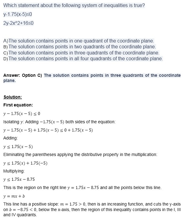 Answer: Option C) The solution contains points in three quadrants of the coordinate plane.