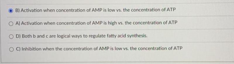B) Activation when the concentration of AMP is low vs concentration of ATP