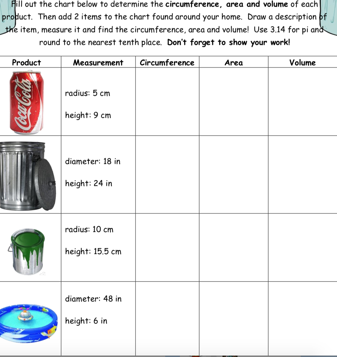 To solve the second part to the problem just find the two items in your home and solve for the circumference, surface area, and volume. You can look back at my steps for formulas if you need help.</span></span>