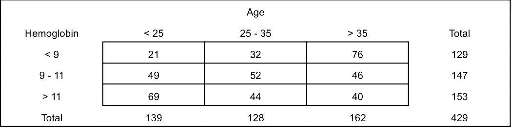 d) The probability that a person older than 35 years has a hemoglobin level between 9 and 11 = 0.2840