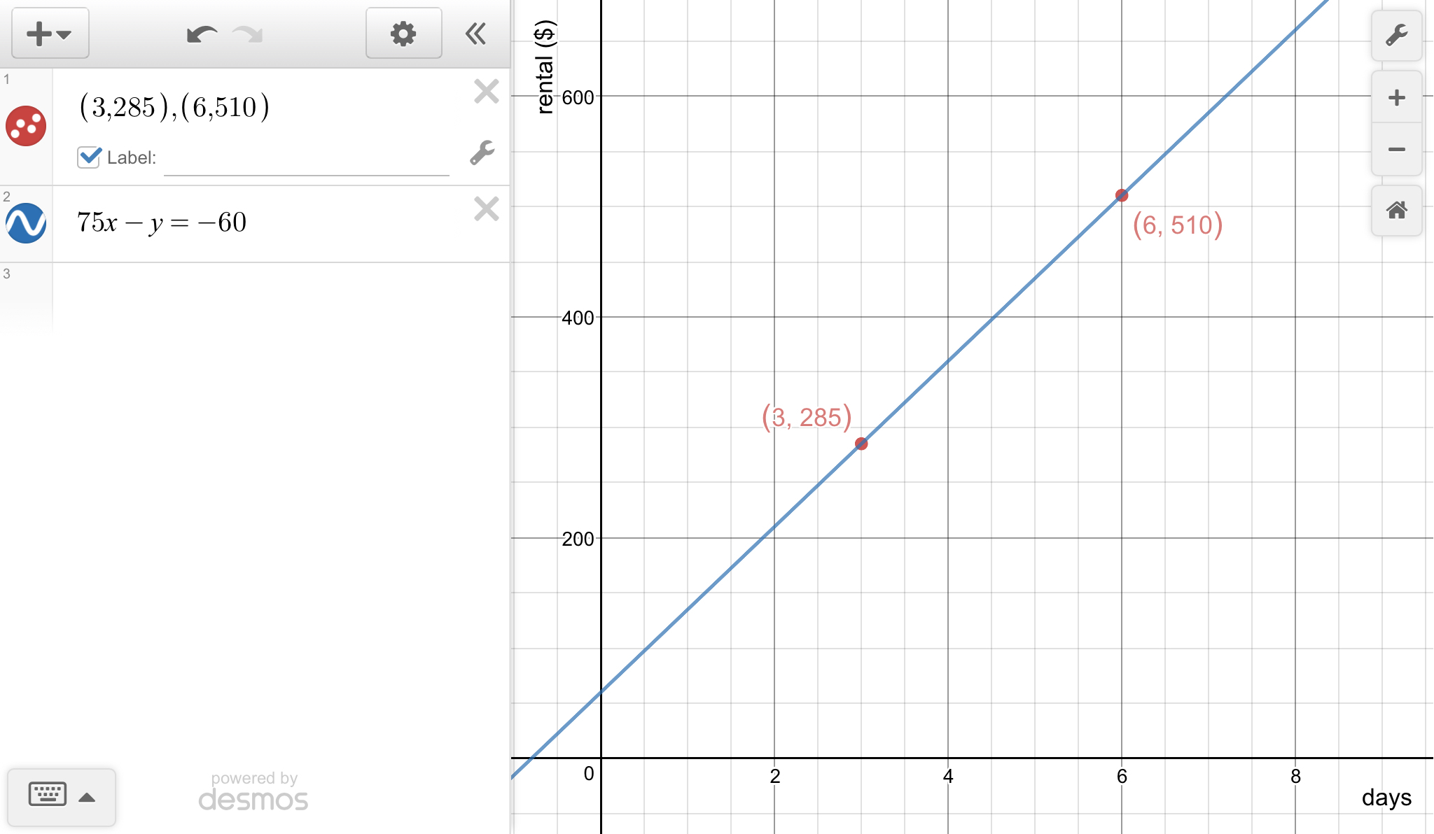 Two points (days, rent) = (3, 285), (6, 510)
