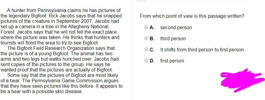 The answer is B) Third Person, because it uses words such as “he, and “it”.