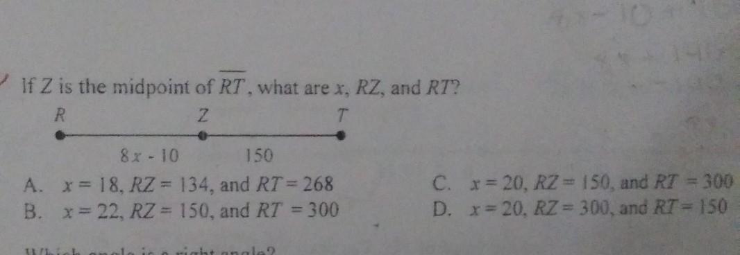 We can first find RZ. A midpoint is the point right in the middle of a line segment. It splits the line into two equivalent lengths. If z is the midpoint of RT, it therefore splits RT into two equivalent segments, RZ and ZT. Thus, the length of RZ is equivalent to ZT, therefore, the length of RZ is 150.