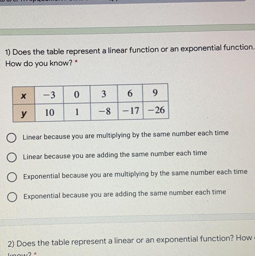 Linear bc you are adding the same number each time. In this case, every time x increases by 1, y decreases by 3.