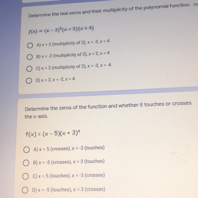 2.The multiplicity of something is how many times the same zero is there. It is the exponent outside of the equation. For the first question, the (x - 2) has an exponent of 2, thus it has the multiplicity of 2.