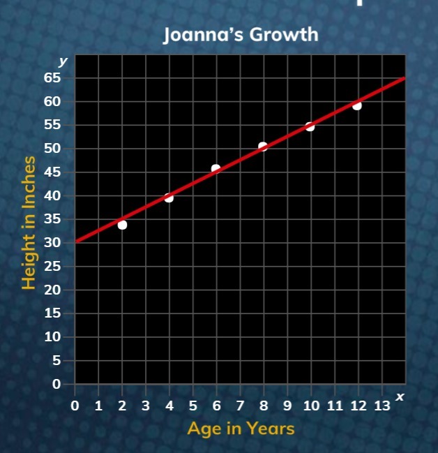 The given graph sh a shows scatter plot and linear model of Joanna's height, in inches, for various ages.