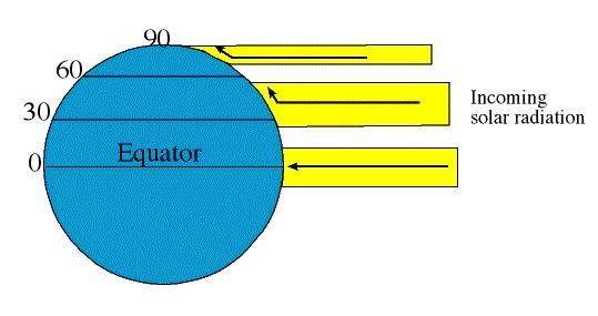 Indeed, the solar radiation hits the surface with different angles between the equator and the poles: the angle the light rays form with the vertical line above a position is 90° at the poles, 23° at the tropics and 0° at the equator (see picture attached).