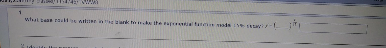 what base could be written in the blank to make the exponential function model 15% decay ? y= (____) ^t\12