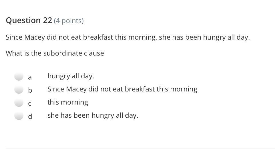 Since Macey did not eat breakfast this morning, she has been hungry all day.