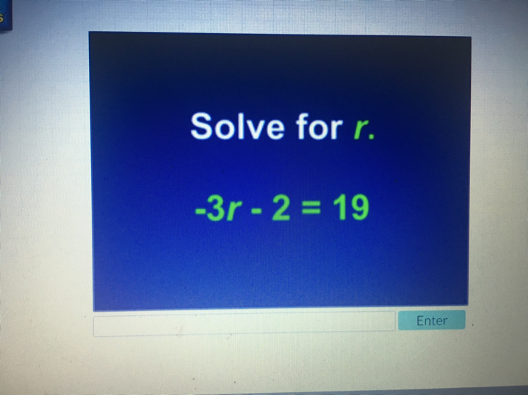 The first step you'd do in this question is add the two to both sides since it doesn't have a number attached to it This will minus the -2 from the left hand side and add it to the right hand side so now your question will look like this: -3r=21 Got it? Okay so now that's done divide the -3 on both sides so 21 divided by -3 so now your Answer will look like this: r=-7 hehehe sorry about that no wonder I'm generally bad at Maths, I get confused X3