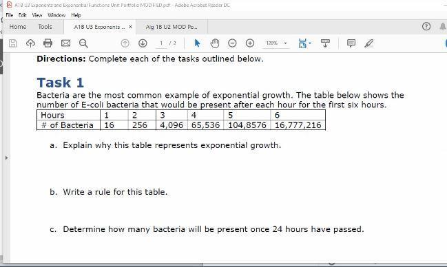 b) n = 16^t . . . . . n is number of bacteria; t is hours