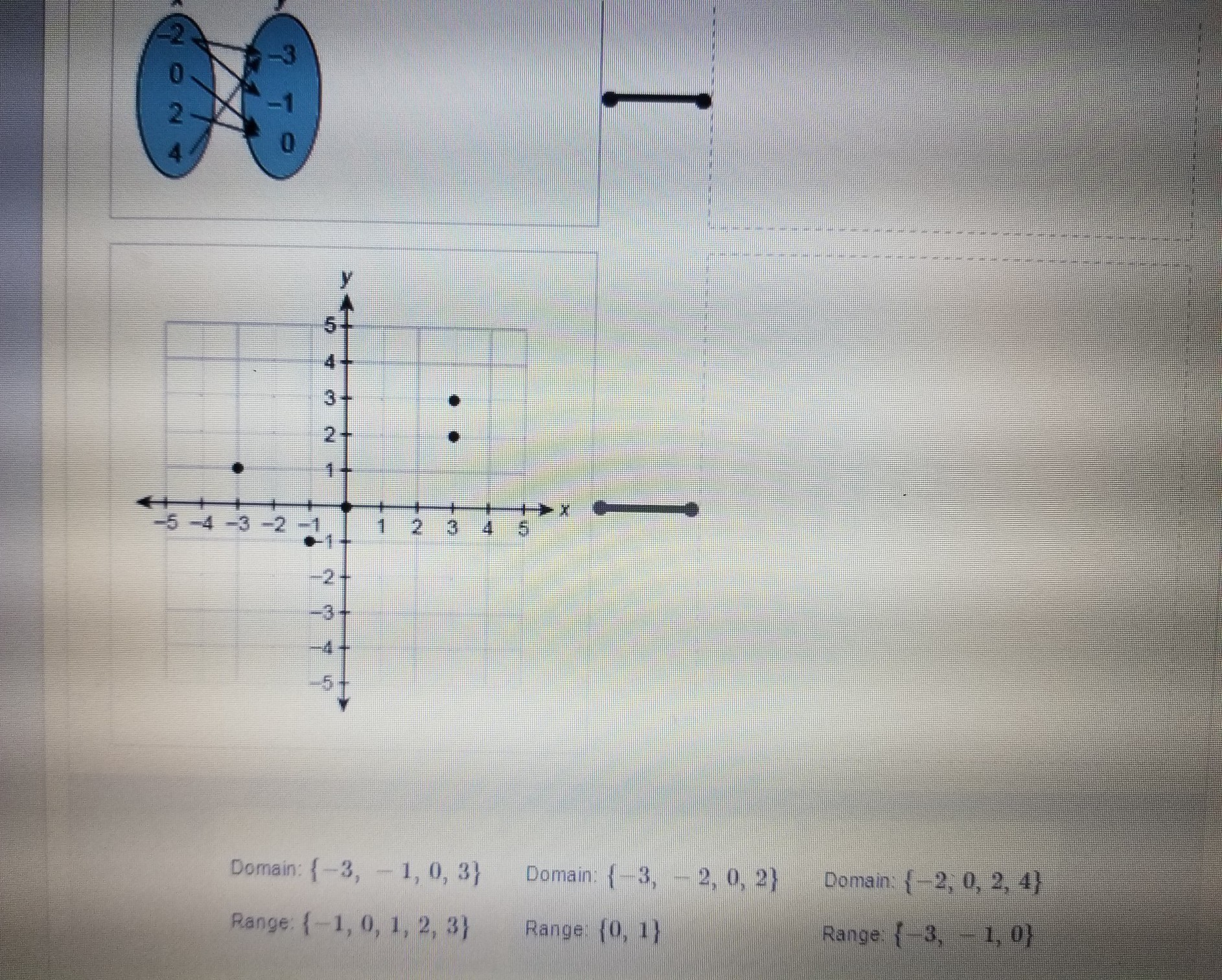 Answer: The domain and range of the first figure are D= {-2,0,2,4} and R={-3,-1,0}. The domain and range of the second figure are D={-3,-1,0,3} and R={-1,0,1,2,3}.