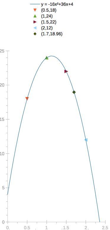 When x = 1.7, y = -16·1.7² + 36·1.7 + 4 = 18.96 ft