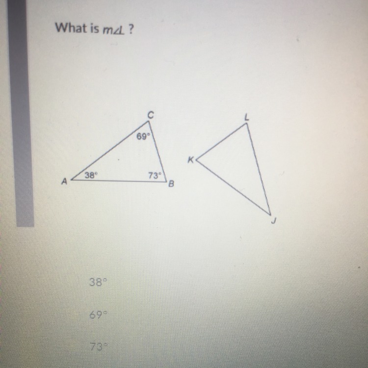 The size of Angle L should be the same as Angle C if the triangles are congruent (or at least similar) Since Angle C = 69o, then Angle L also = 69o. You should be very careful in accepting this assumption because looks can deceive. However if the assumption of congruency is not true, there is no way to solve the problem. L = 69o.