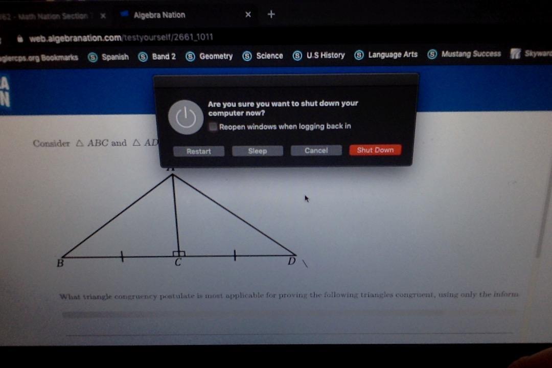 Then two triangles ABC and ADC are congruent by SAS postulate, or two right triangles ABC and ADC are congruent by LL postulate.