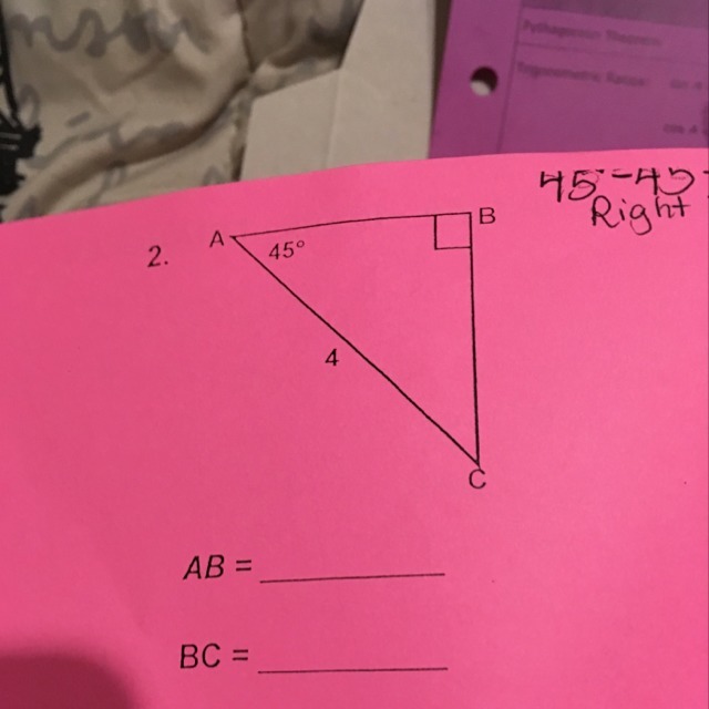 Since this is a 45-45-90 triangle, the two shorter sides are equal, and so BC = 2√2 also.