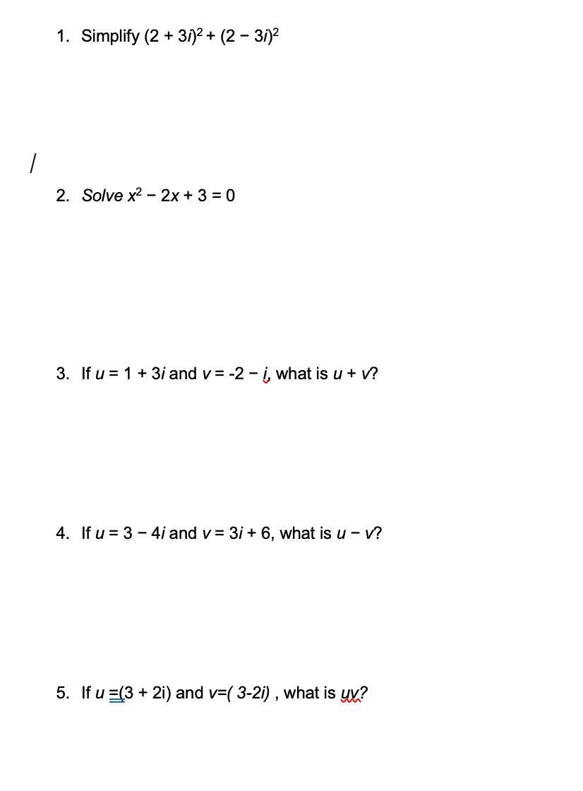 3. If u =1+3i and v =-2-i what is u+v