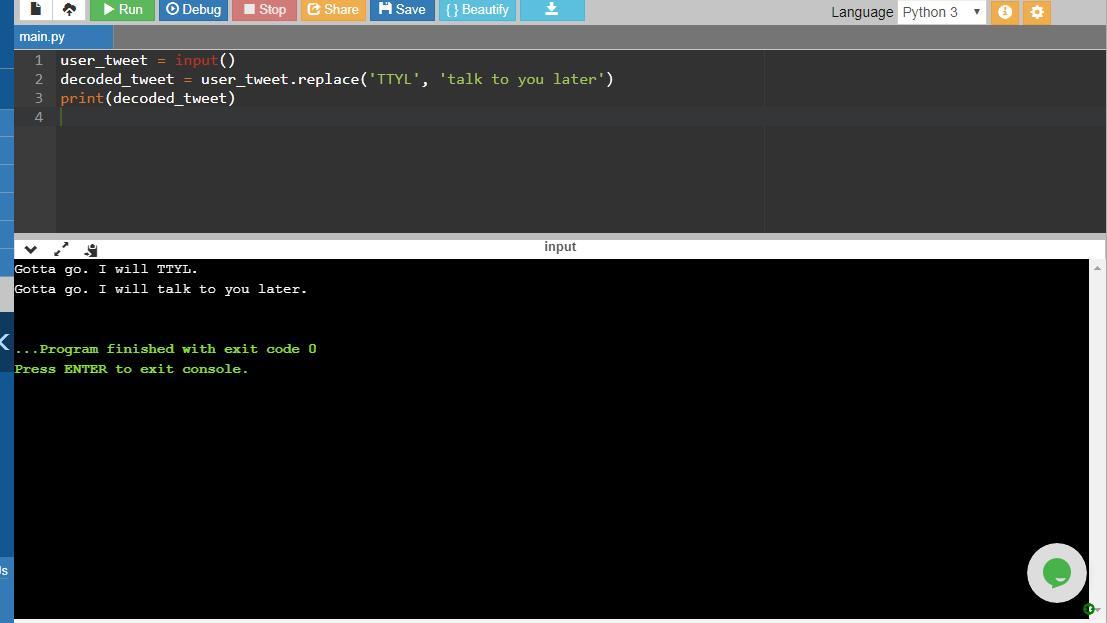 So this new string is assigned to decoded_tweet, after replacing 'TTYL' with 'talk to you later' in user_tweet.