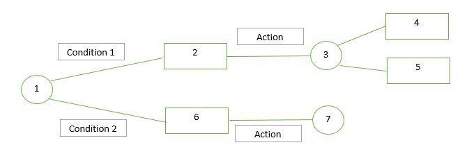 For showing control stream in organized investigation we use Flow diagrams, But for indicated choice in organized examination, we frequently use choice tree. In choice tree we use hover for current state. An example decision tree is attached with the appropriate response, benevolently allude the equivalent.