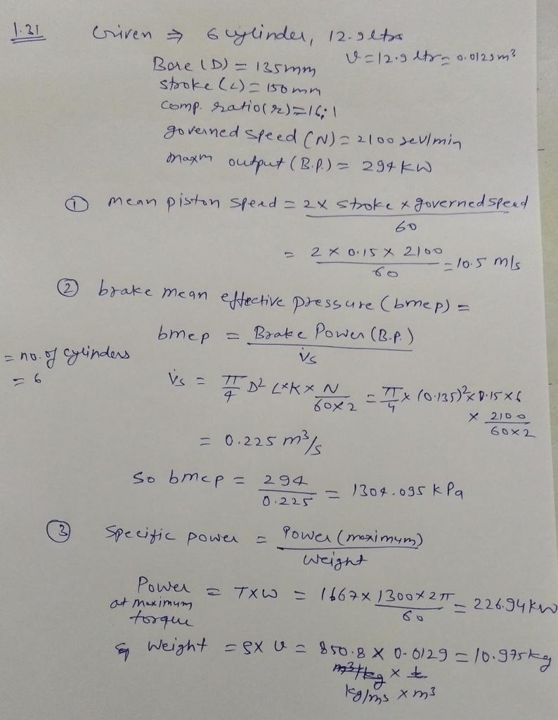 Calculate the mean piston speed, bmep, and specific power of: (a) the spark-ignition engines in Figs. 1.11 and 1.13 at their max