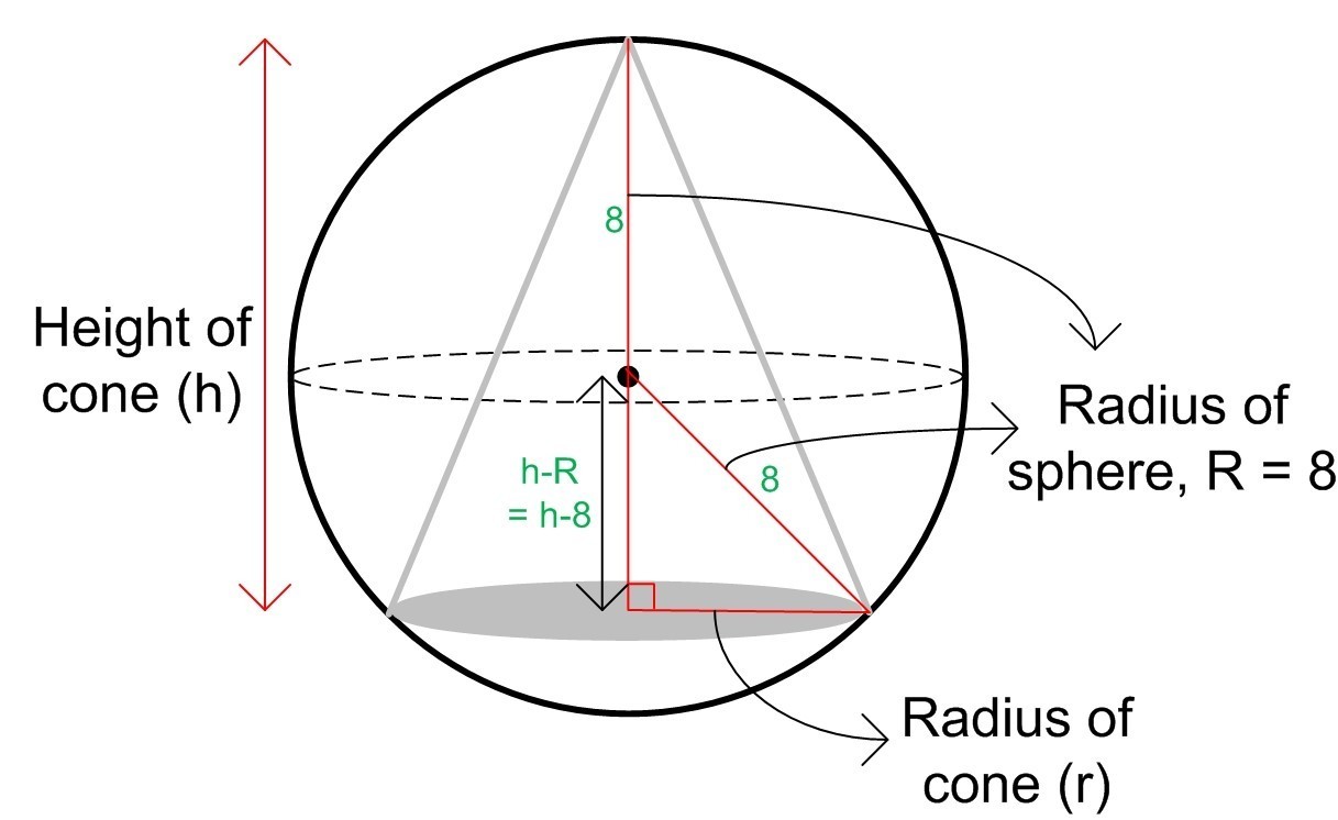 Referring to the diagram, we can start with the right-angle triangle that has two short sides; the radius of the cone and the (h-r) and the hypotenuse 'R' which is the radius of the sphere.