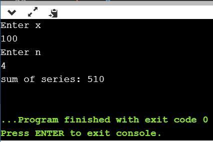Then we have driver code in the main function where we ask the user to enter x and n values and then called the seriesFunction to calculate the sum of series