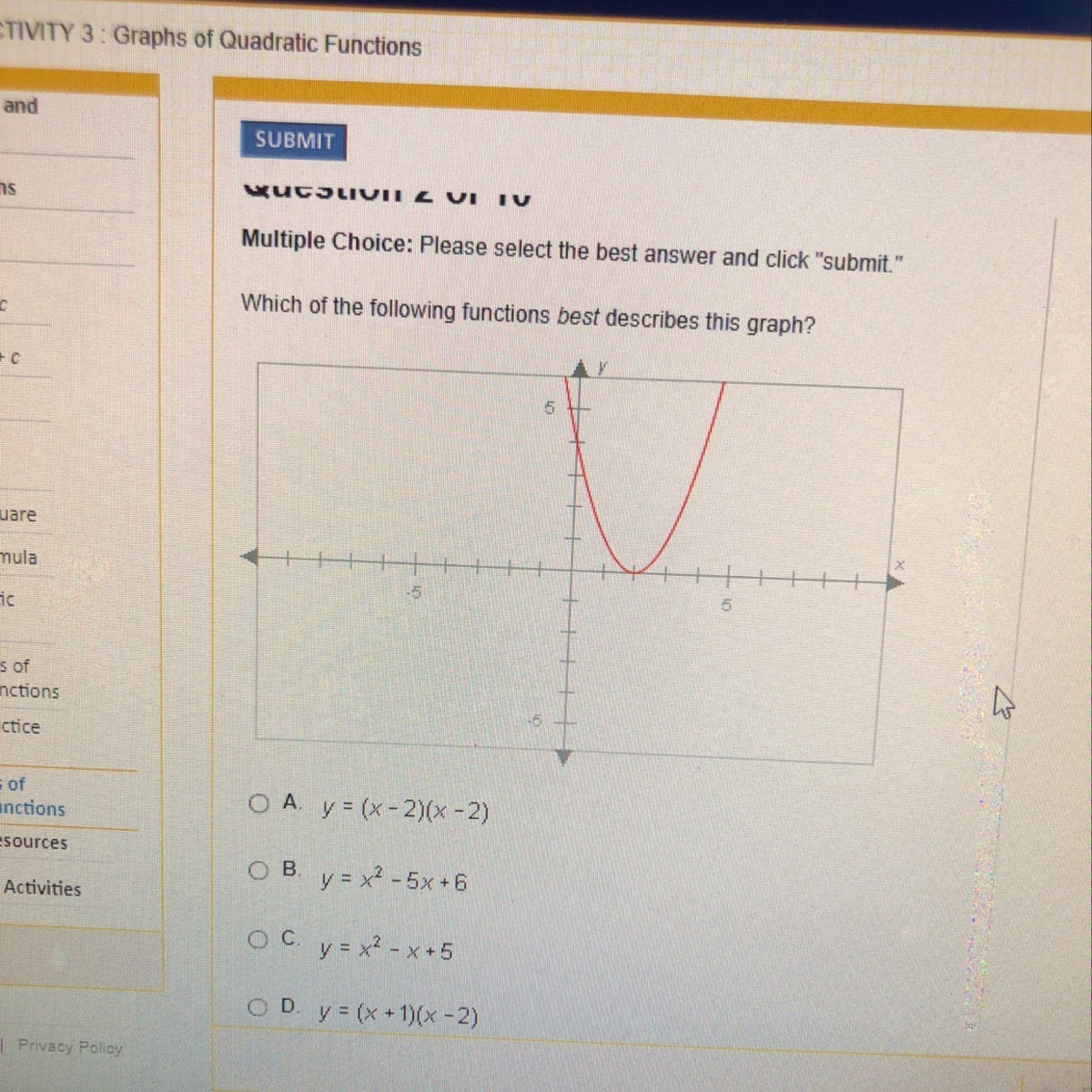 The equation of the following graph is y = ( x - 2 ) ( x - 2 )