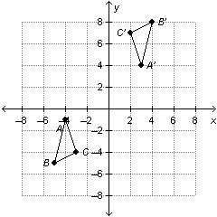 Point A, initially at (-4, -1), moves to A' at (3, 4). Point B (-5, -5) moves to B' (4, 8). Point C (-3, -4) moves to C' (2, 7). The first choice: rotating 180 degrees about the origin changes to sign of both x- and y-coordinates, so A(-4, -1) goes to (4, 1). Moving 3 up goes to (4, 4), and 1 left is (3, 4). For B(-5, -5), rotating brings it to (5, 5), up 3 to (5, 8), 1 left to (4, 8). For C(-3, -4), rotate to (3, 4), up 3 to (3, 7), 1 left to (2, 7). So since all points match up, this first choice is a correct answer. The second choice does not work since: translating A 3 up and 1 left brings it to (-5, 2), and rotating it 180 degrees would then put A' at (5, -2). The third choice: rotating A 90 degrees clockwise puts it at (-1, 4), and reflecting it over the y-axis puts it at (1, 4). The fourth choice: rotation A 90 degrees counterclockwise puts it at (1, -4), and reflecting it over the x-axis puts it at (1, 4). The fifth choice: translating 3 down and 1 right puts A at (-3, -4), then a 180-degree rotation puts it at (3, 4). B(-5, -5) translated goes to (-4, -8), and rotating brings it to
